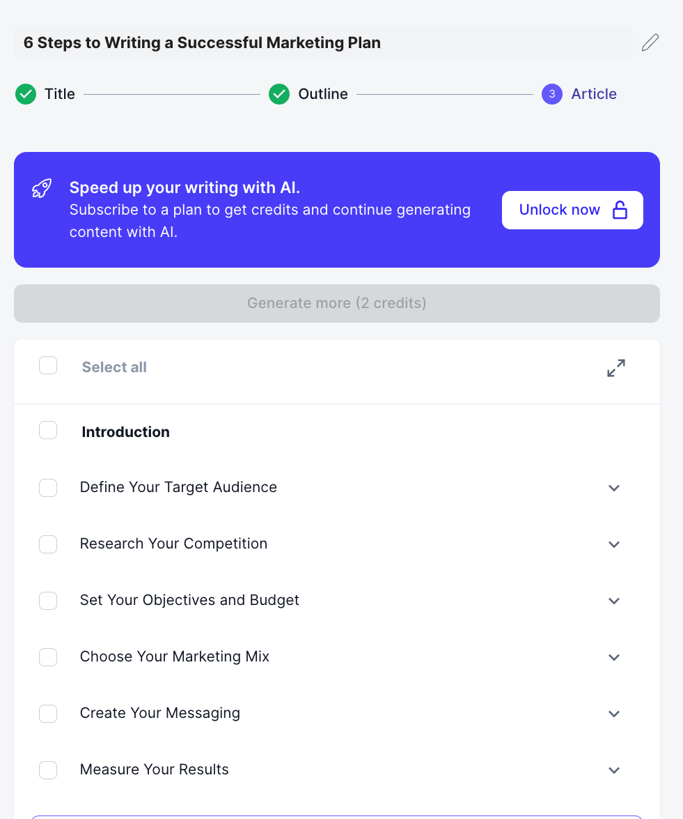 In my test, I wanted to create an article on how to write a marketing plan. So, I inserted “marketing plan” as my keywords.